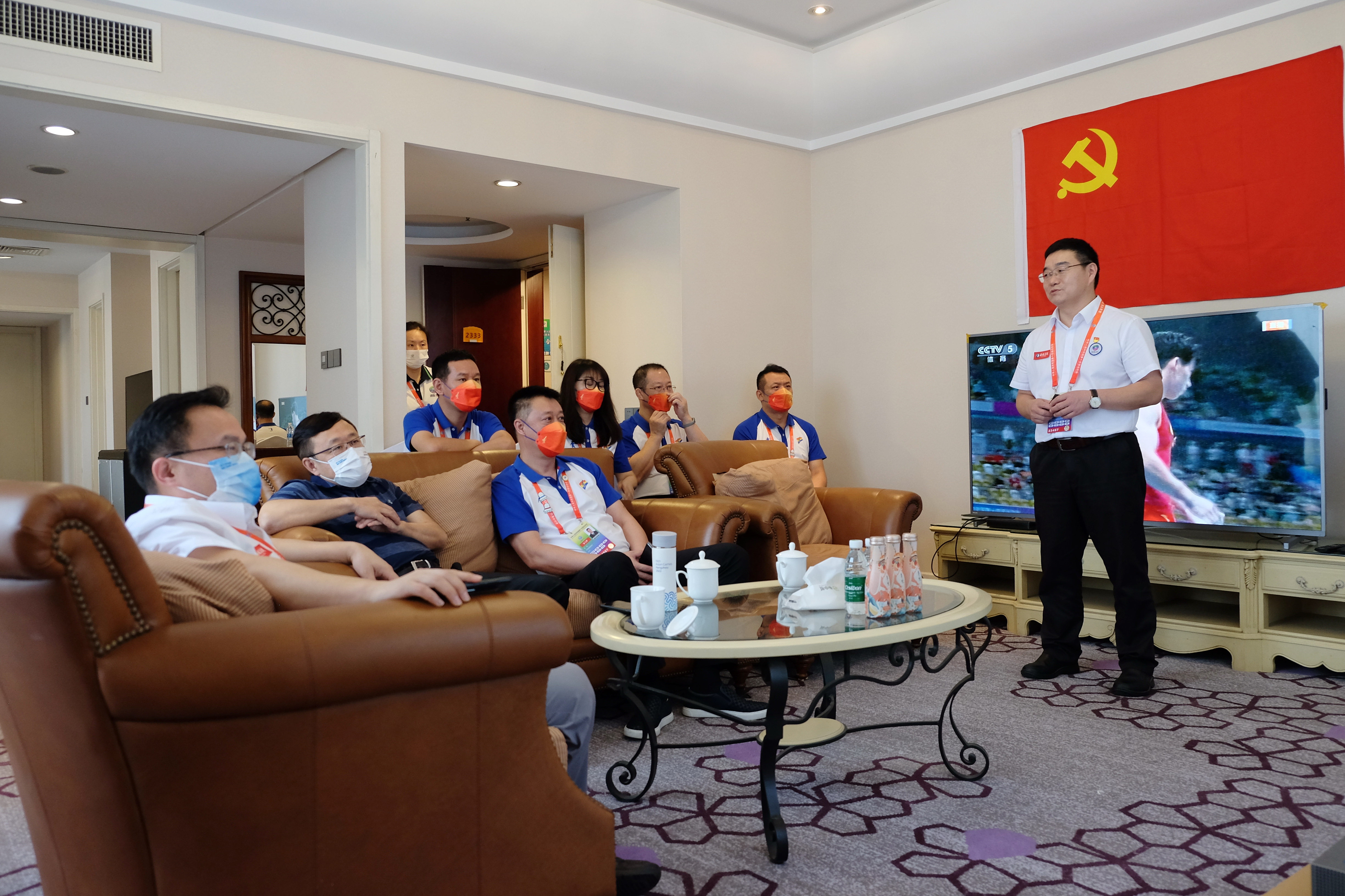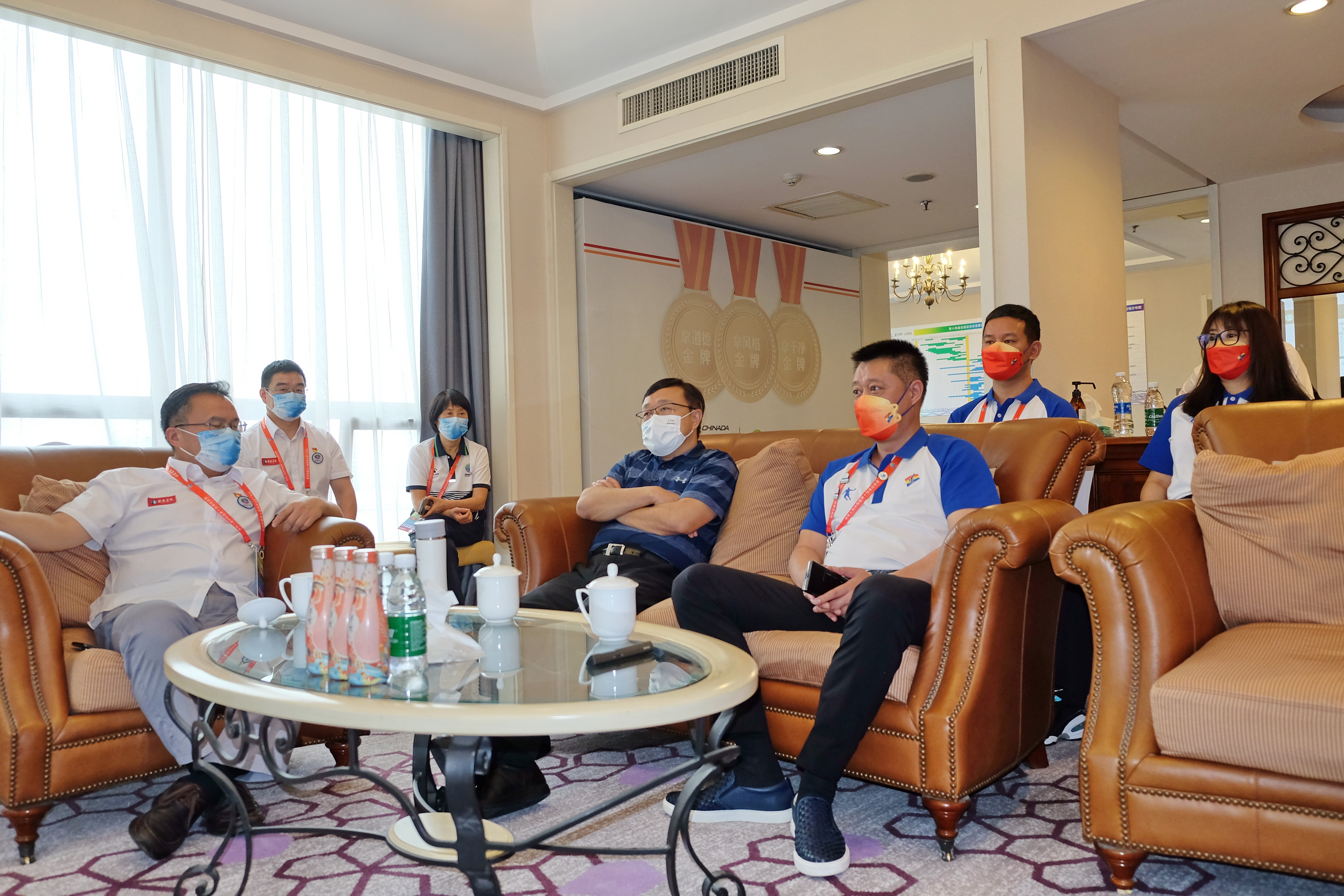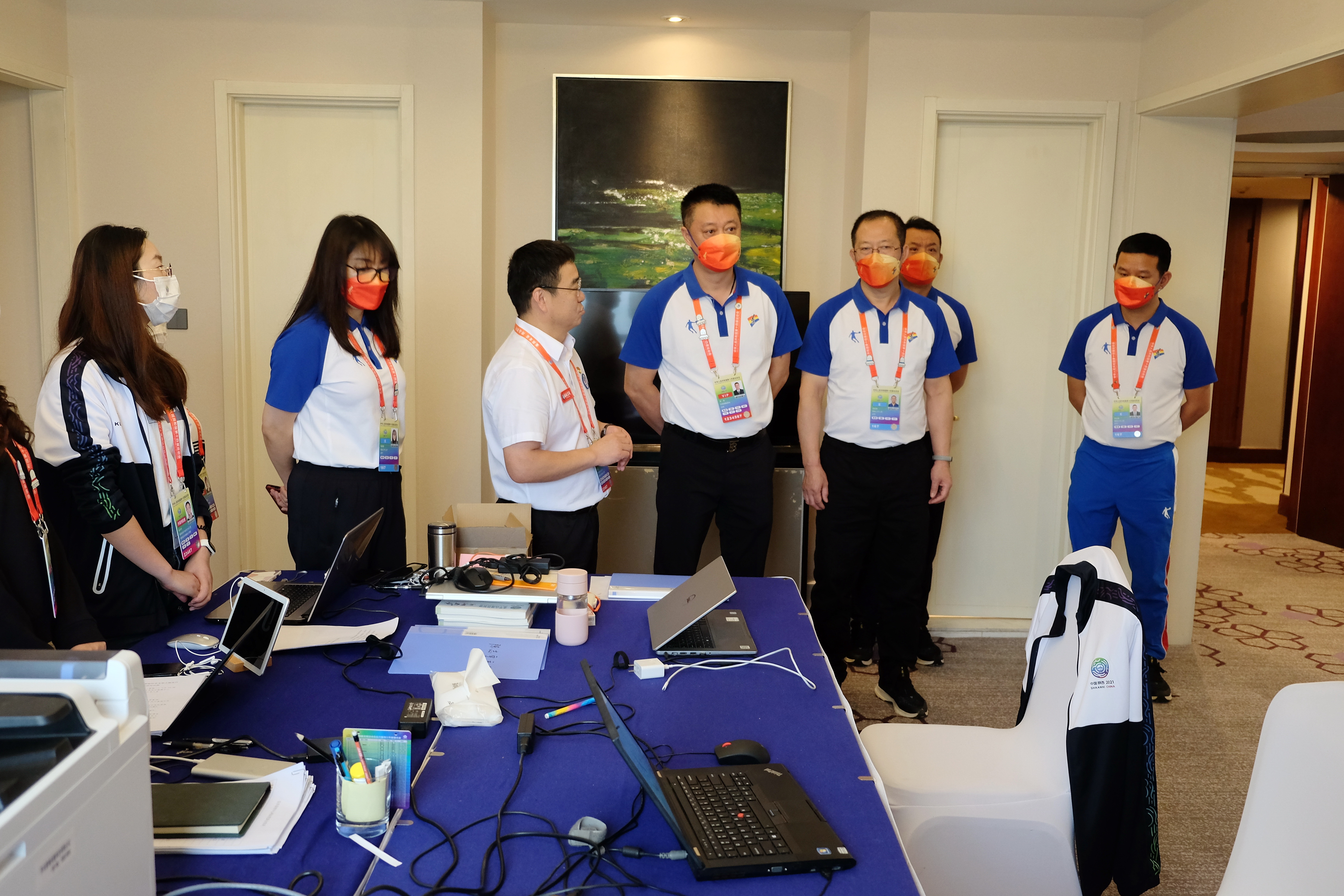 9月23日下午,十四运会辽宁省体育代表团副团长、辽宁省体育事业发展中心主任岳伟带领代表团一行来到十四运会反兴奋剂工作运行指挥中心观摩学习。十四运会反兴奋剂工作部部长、国家体育总局反兴奋剂中心主任、党委书记陈志宇,副部长、反兴奋剂中心副主任王新宅,检查处副处长杨晓晔、温洪涛,运行管理处副处长刘卫国等领导热情接待了代表团一行。辽宁省体育代表团成员、省体育事业发展中心副主任张惠莹等人陪同观摩学习。