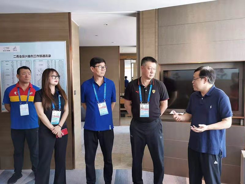第二届全国青年运动会辽宁代表团副团长,辽宁省体育事业发展中心主任岳伟带领二青会辽宁代表团一行7人于8月16日参观、学习第二届全国青年运动会反兴奋剂工作部运行指挥中心。反兴奋剂工作部凌琳和杨晓晔副处长分别介绍了二青会综合运行和检查运行情况,闫青萍副处长介绍了二青会独立观察员项目内容。省体育事业发展中心副主任张惠莹、邵凯和相关单位同志陪同。