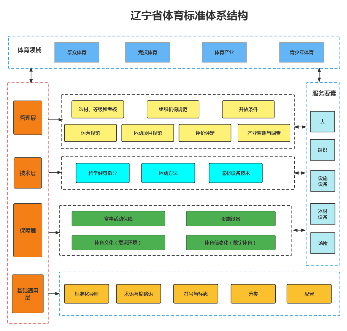 6.领域层.领域层代表了以运动项目需求为导向,体育标准化工作开展的范围,是体育标准化服务于各类运动项目的载体,包括群众体育、竞技体育、体育产业和青少年体育。
