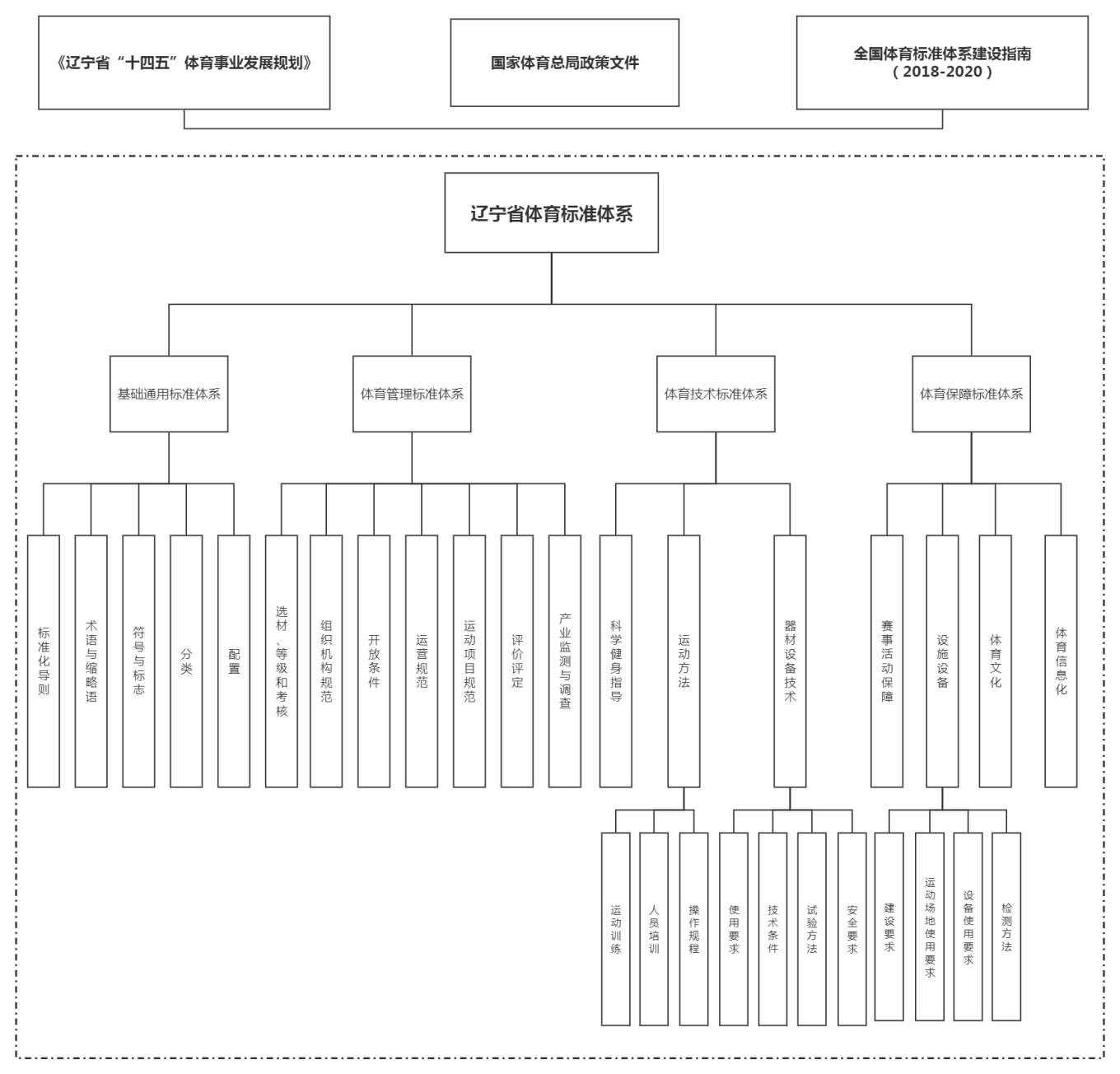 在国家《体育标准体系建设指南(2018-2020)》基础上, 结合我省体育产业发展实际,系统梳理体育领域需要制定的相关标准,统筹资源、分类指导,根据体育事业发展水平,构建与国家标准体系配套衔接、相互支撑的辽宁省标准体系,体系覆盖群众体育、竞技体育、体育产业、青少年体育等重点领域和关键环节。