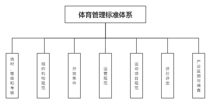 体育管理子体系包括选材、等级和考核、组织机构规范、开放条件、运营规范、运动项目规范、评价评定和产业监测与调查七个部分,如图4所示。