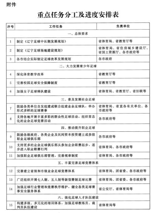 按照足球改革发展重点和进程,结合各地区工作基础和实际情况,科学制定重点任务推进时间表。鼓励大连市发挥足球城示范作用,支持沈阳市足球之都建设,加强指导推进,总结推广典型经验和有效做法,以点带面推动全省足球提速发展。